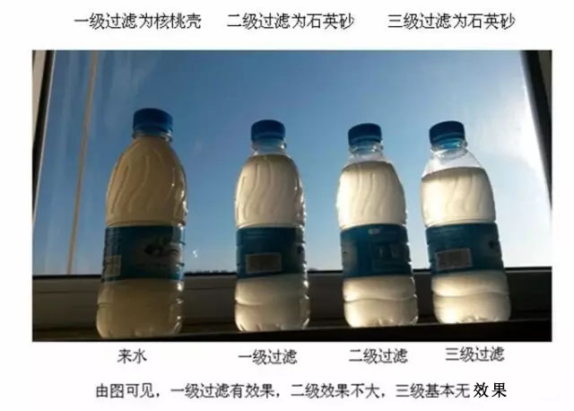 2現存主要問題 1 現有回注水處理工藝大多為:核桃殼+石英砂或核桃殼+一級石英砂+二級石英砂過濾工藝,隨著采油技術的發展,例如化學驅油,三元共驅工藝的實施,水中聚合物含量升高,現有的設備逐漸難以滿足回注水要求。 2 核桃殼和石英砂過濾罐頂部一般設有攪拌器,目的在于對因油而兒粘連的濾料進行分離,但實際效果并不理想,對懸浮物和油的截留效果均有待提升。 3 正因為上述問題,現有處理設備已經越來越難以滿足設計要求,并不是設備不好,而是進水的水質變差了,而出水要求仍然不變或更高了。只有更新換代才能滿足更高的技術要求。 4 由于產油中水的比例越來越高,有的已經高達90%,因此原來設計的老設備不但技術要求達不到,產量也難以滿足逐漸增多的水量要求。 5 下圖是某油田回注水現場過濾效果取樣,三級過濾工藝,進入第一級過濾之前加絮凝劑,第一級為核桃殼,第二級為石英砂,由于出水效果不符合要求,又增加了第三級石英砂過濾,但是效果不明顯。分析原因既包括絮凝問題也包括過濾精度問題。