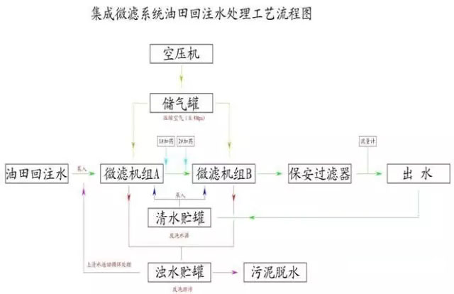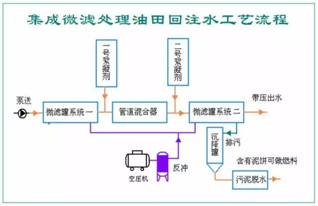 3微濾技術路線 集成微濾技術包括了:微絮凝+微濾 采用微濾罐適用于物理性水處理,主要功能是去除水中的懸浮物和膠體,對于溶解性物質,例如溶解性含聚水,則單純依靠物理手段還不夠,集成微濾系統指的是:在微濾前面設置絮凝程序,在水中添加適當的反絮凝劑或破乳劑,其中包括有機,無機,生物和礦物質絮凝劑,針對不同的水質進行復配,將溶解性物質轉變為非溶解性懸浮物,進而通過高精度的微濾罐濾除,而微絮凝則是省略了傳統該工藝中的攪拌池和沉淀池工藝,在管道中加藥直接進入微濾罐。這是針對油田回注水的實際情況而研發的專用設備系統。