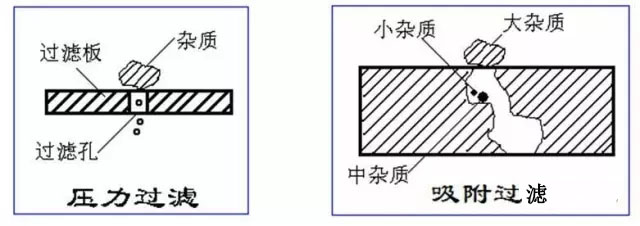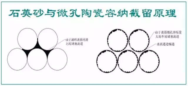 石英砂(或海砂)表面光滑且基本沒有空隙,因而截留懸浮物基本靠的是顆粒之間的縫隙,截流的雜質很快堵塞流道,繼續過濾則形成污泥層,水流穿過逐漸加厚的污泥層會引起水頭升高或過濾壓力升高,對于實際過濾設備或過濾池的表現就是,反沖洗周期縮短,消耗較大的反沖水耗與能耗。 輕質微孔陶瓷濾料表面幾乎被可見孔布滿,并且存在許多顯微孔,這些孔徑極易截留雜質,而雜質的滯留并不影響顆粒之間的空隙,因而占用有效流道的時間要比傳統砂濾長很多,也就是反洗周期長。 四 微孔陶瓷過濾截留機理 下圖表示二種不同形式的過濾原理,傳統砂濾實際上是壓力機械阻擋為主,小孔截留大的雜質,過濾精度取決于表層沙粒的大小,例如,過濾罐實際裝填的濾料最小僅為0.5-1.2mm,而采用新型輕質微孔陶瓷節能型微濾的機理是:除了機械阻擋以外,還兼有化學物理吸附,以渣濾渣等復合截留作用。用其制造的過濾設備有如下特點: ● 同比條件下,濾料直徑可以放大1~2個級別,例0.5mm的石英砂可以改為1~3mm的微孔陶瓷,這意味著提高了容垢量或延長了反沖洗周期。 ● 同比條件下降低了過濾壓降,而降低壓降就是節能,當用于壓力過濾罐時,大部分過濾周期中,進出水表觀壓降幾乎為零,實際壓降0.01Mpa~0.05Mpa。 ●由于比重輕(1.1g/cm3),容重也輕(0.6~0.7g/cm3),因而大大降低了反沖洗能耗,對采用大流量的微濾系統而言,無需專用的反洗水箱及大流量水泵,可不受傳統的水力沖洗原理約束,無需罐頂中心的攪拌器,同比節約80%的反沖洗用水和80%的反洗能耗。