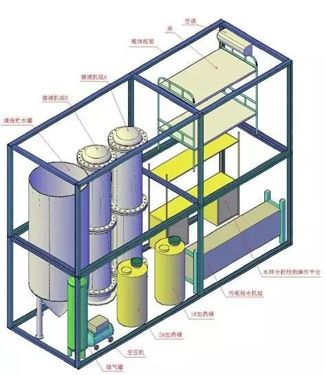 說明:設備系統可以承受高濁度(1000mg/L)進水和高含油量(1000mg/L)進水。出水仍然可維持在上述指標,但是運行費用會增加。 立體圖示