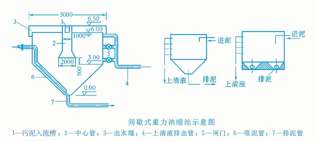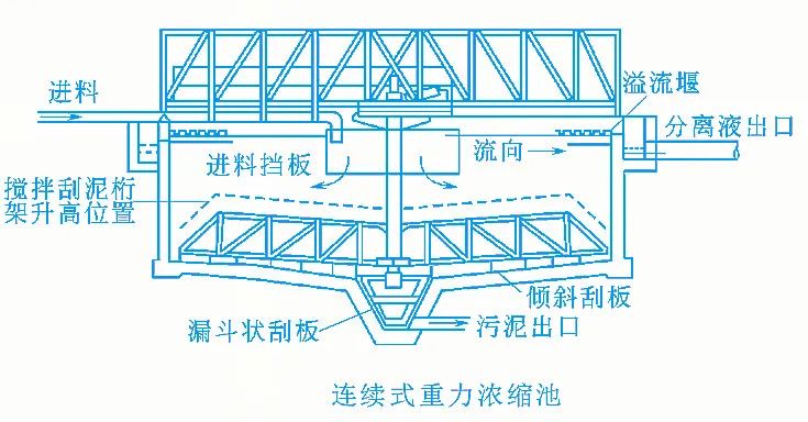 連續(xù)式重力濃縮池的進泥與出水都是連續(xù)的,排泥可以是連續(xù)的,也可以是間歇的。當池子較大時采用輻流式濃縮池;當池子較小時采用豎流式濃縮池。