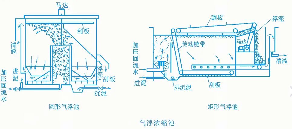 氣浮濃縮法多用于濃縮污泥顆粒較輕,相對密度接近于1的污泥,氣浮濃縮有部分回流氣浮濃縮系統(tǒng)和無回流氣浮濃縮系統(tǒng)兩種,其中部分回流氣浮濃縮系統(tǒng)應(yīng)用較多。
