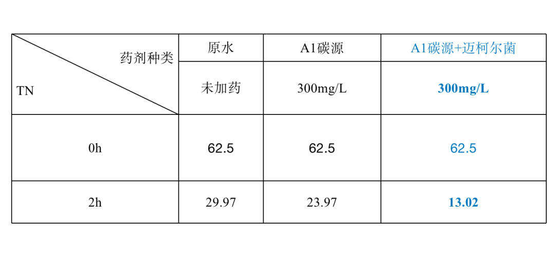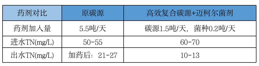 小試篩選 針對(duì)現(xiàn)場(chǎng)水質(zhì)狀況,在實(shí)驗(yàn)室進(jìn)行小試碳源篩選及菌劑評(píng)價(jià)測(cè)試,尋求最佳解決方案。通過(guò)對(duì)比試驗(yàn),我公司決定采用“高效復(fù)合碳源+邁柯?tīng)柧N”方案來(lái)解決系統(tǒng)脫氮問(wèn)題。