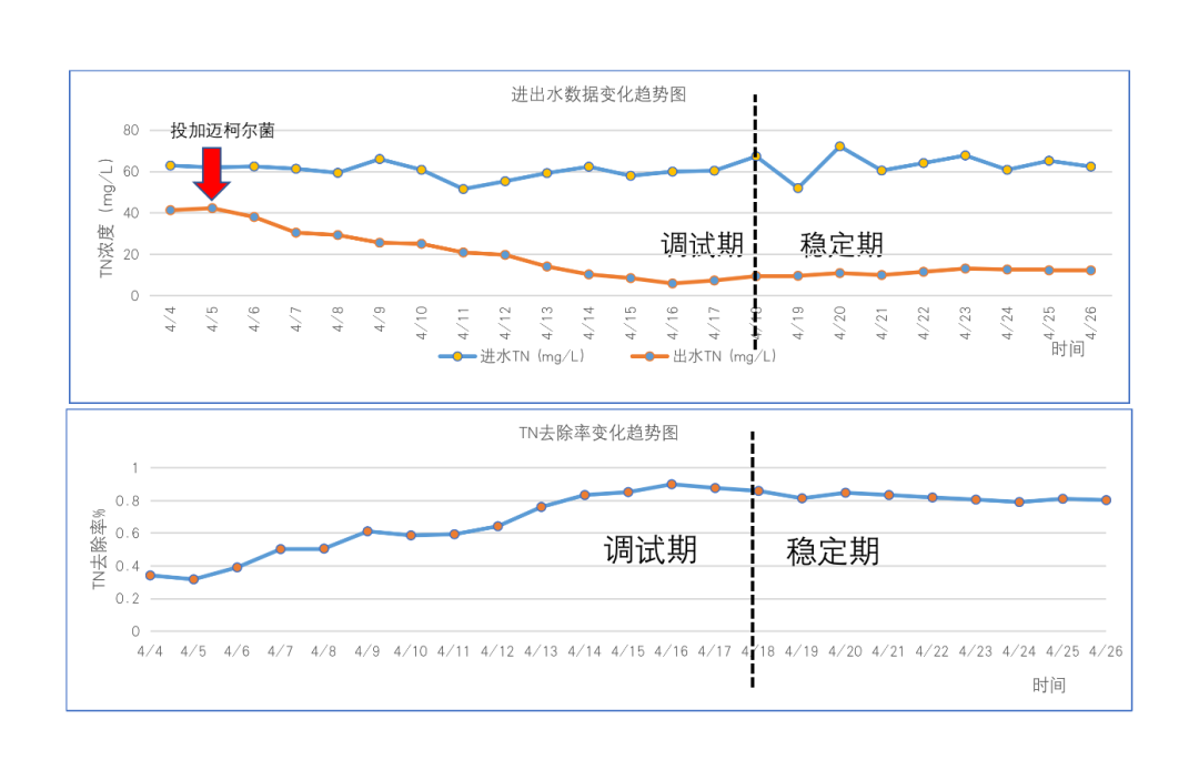 現(xiàn)場(chǎng)實(shí)施效果 通過(guò)現(xiàn)場(chǎng)工藝運(yùn)行調(diào)整與菌劑投加合理匹配,運(yùn)行穩(wěn)定后,系統(tǒng)出水達(dá)標(biāo)排放標(biāo)準(zhǔn)。實(shí)施前,系統(tǒng)出水總38~42mg/L,菌劑投加第二天,出水總氮持續(xù)降低,最終出水總氮穩(wěn)定在10~13mg/L,效果顯著。