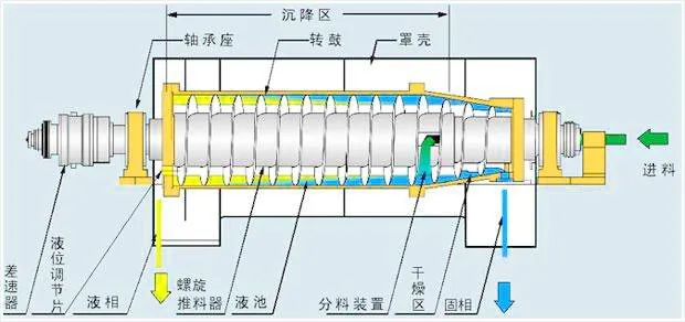 轉(zhuǎn)鼓直徑和有效長度 轉(zhuǎn)鼓直徑越大,有效長度越長,其有效沉降面積越大,處理能力也越大,物料在轉(zhuǎn)鼓內(nèi)的停留時(shí)間也越長,在相同的轉(zhuǎn)速下,其分離因數(shù)就越大,分離效果越好。